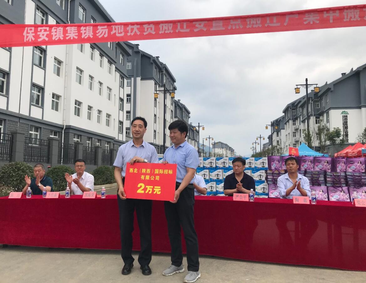 2019年6月26日,洛南縣保安鎮(zhèn)人民政府組織舉辦了保安鎮(zhèn)易地扶貧移民搬遷戶集中入住捐贈(zèng)儀式,縣委常委、常務(wù)副縣長李凌云同志,以及西北(陜西)國際招標(biāo)有限公司、中建一局西北公司等相關(guān)單位參加。捐贈(zèng)儀式上,我公司胡亞夫主任代表公司扶貧獻(xiàn)愛心向洛南縣保安鎮(zhèn)人民政府捐款2萬元整。