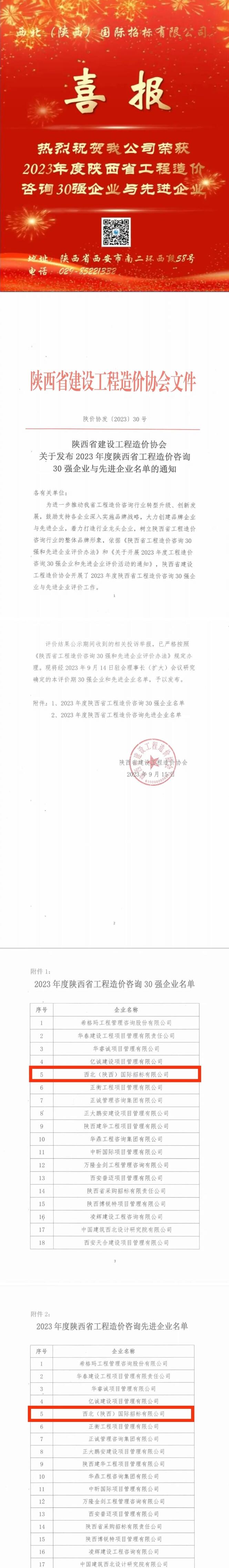 熱烈祝賀我公司榮獲2023年度陜西省工程造價咨詢30強企業(yè)與先進企業(yè)