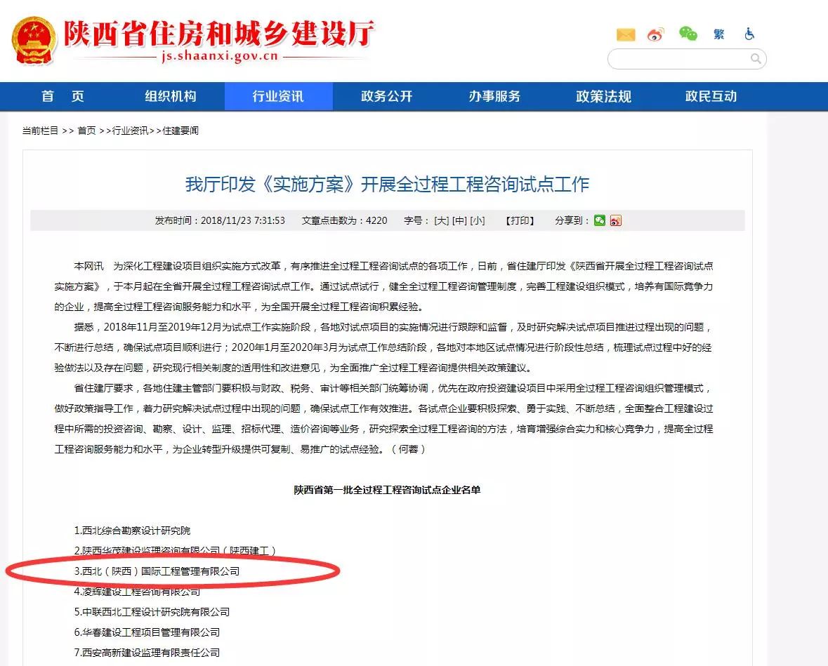 西北(陜西)國際工程管理有限公司入選陜西省住建廳第一批全過程工程咨詢試點(diǎn)企業(yè)名單