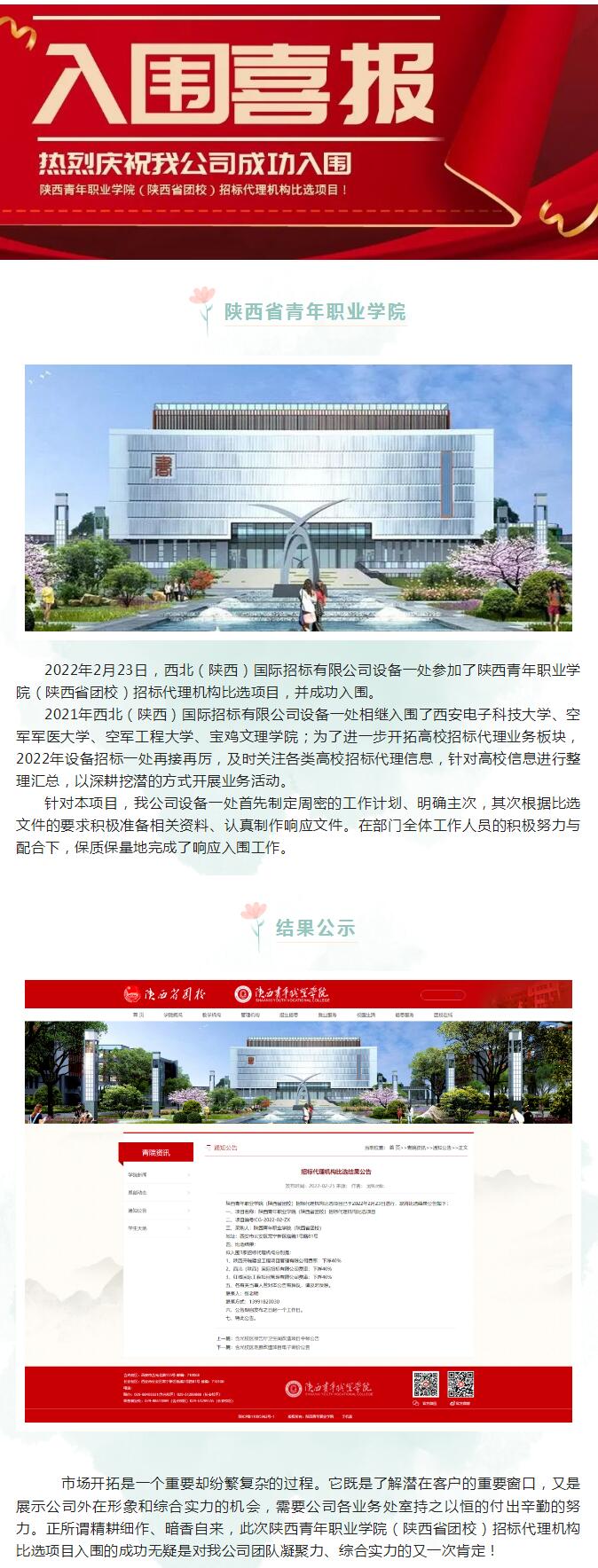 西北(陜西)國(guó)際招標(biāo)有限公司成功入圍陜西青年職業(yè)學(xué)院(陜西省團(tuán)校)招標(biāo)代理機(jī)構(gòu)比選項(xiàng)目