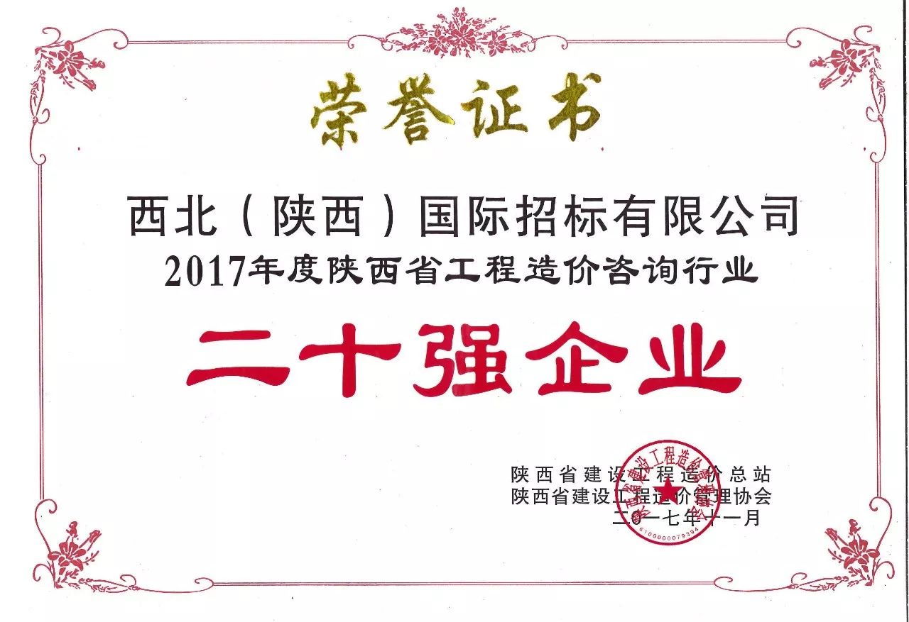2017年11月23日,陜西省建設(shè)工程造價總站和陜西省建設(shè)工程造價管理協(xié)會發(fā)布陜建價站發(fā)〔2017〕06號文件,發(fā)布2017年度陜西省工程造價咨詢企業(yè)營業(yè)收入排序前二十名(陜西省工程造價咨詢行業(yè)二十強企業(yè))名單,西北(陜西)國際招標有限公司再次入圍,榮獲“第八名”。