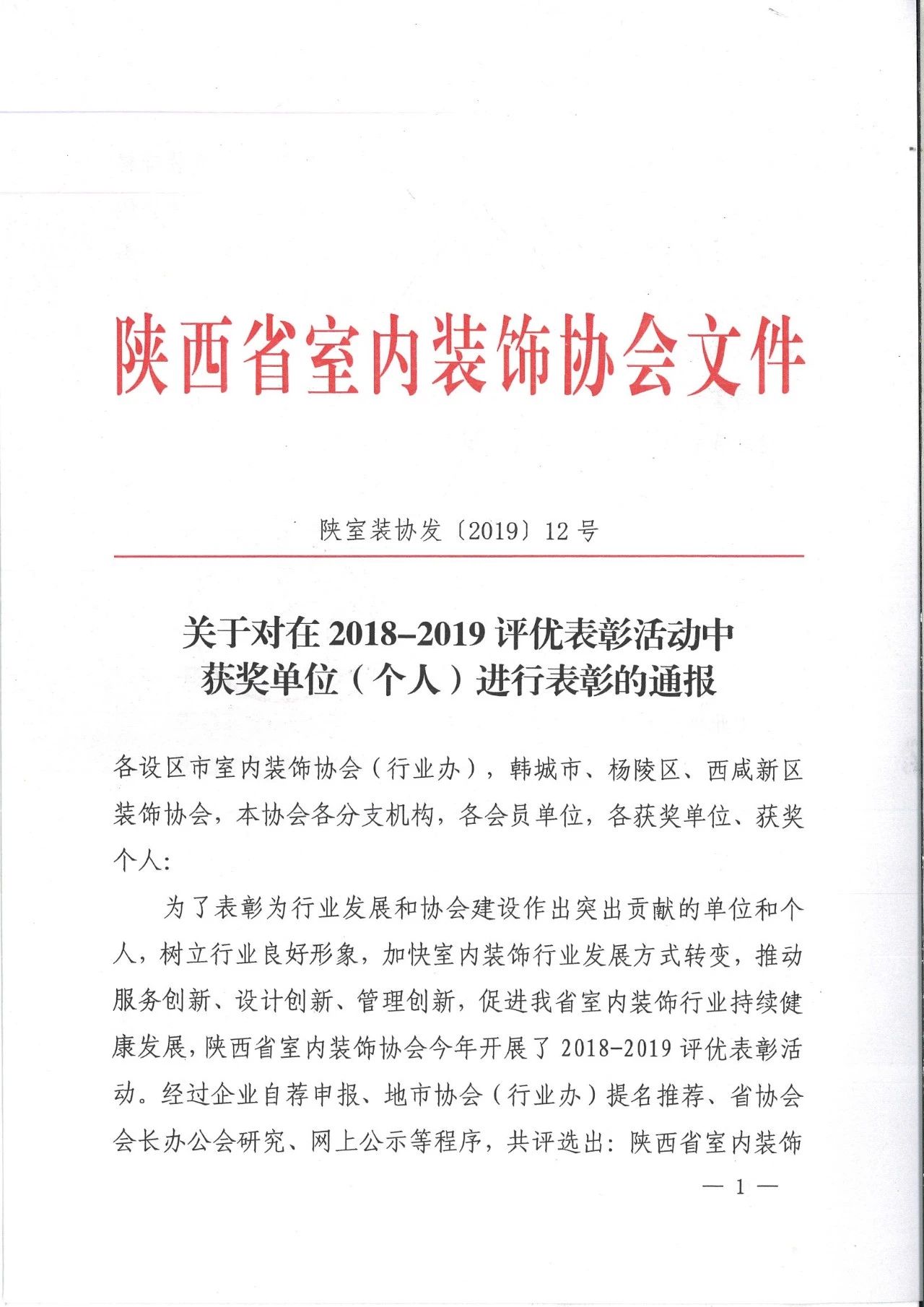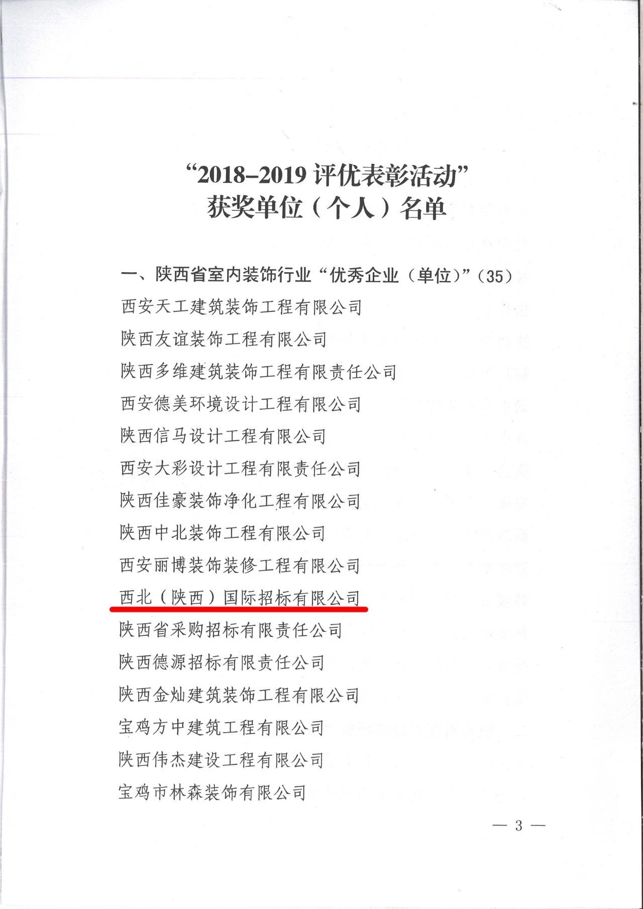 2019年12月26日,“陜西省室內(nèi)裝飾協(xié)會(huì)六屆三次理事會(huì)暨2018-2019行業(yè)表彰大會(huì)”在古都西安召開(kāi),我公司被陜西省室內(nèi)裝飾協(xié)會(huì)評(píng)為2018-2019陜西省室內(nèi)裝飾行業(yè)“優(yōu)秀招標(biāo)代理機(jī)構(gòu)”
