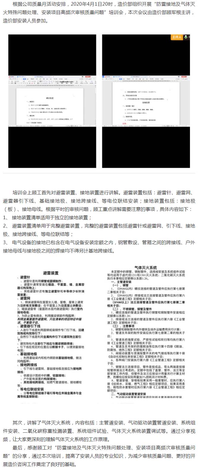 造價(jià)部組織開展“防雷接地及氣體滅火特殊問(wèn)題處理、安裝項(xiàng)目高頻次審核質(zhì)量問(wèn)題”培訓(xùn)會(huì)