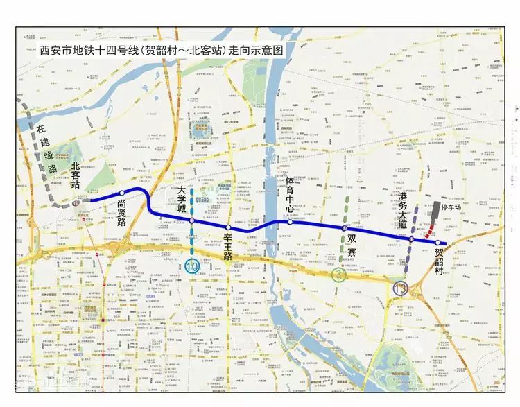 西安地鐵十四號線(最初規(guī)劃為十三號線)為東西走向,規(guī)劃東端起點為國際港務(wù)區(qū)窯村機場西側(cè),跨灞河后抵達北客站,與機場線貫通運營。一期工程為賀韶村到~北客站(不含),主要為配合2021年西安第十四屆全運會建設(shè)。線路長度約13.8km,依次沿向東路-學(xué)府中路(建材北路)-開發(fā)大道鋪設(shè),共設(shè)賀韶村站~港務(wù)大道站~三義莊站(新增)~雙寨站~體育中心站~辛王路站~學(xué)府路(大學(xué)城)站~尚賢路站車站8座(不含北客站),其中換乘站3座,均為地下站,設(shè)一處停車場(賀韶村停車場),設(shè)主變電所1座(太華北路與學(xué)府中路東北象限)。