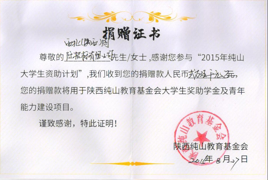 名貧困大學(xué)生,獲陜西省純山教育基金會授予公司捐贈證書。