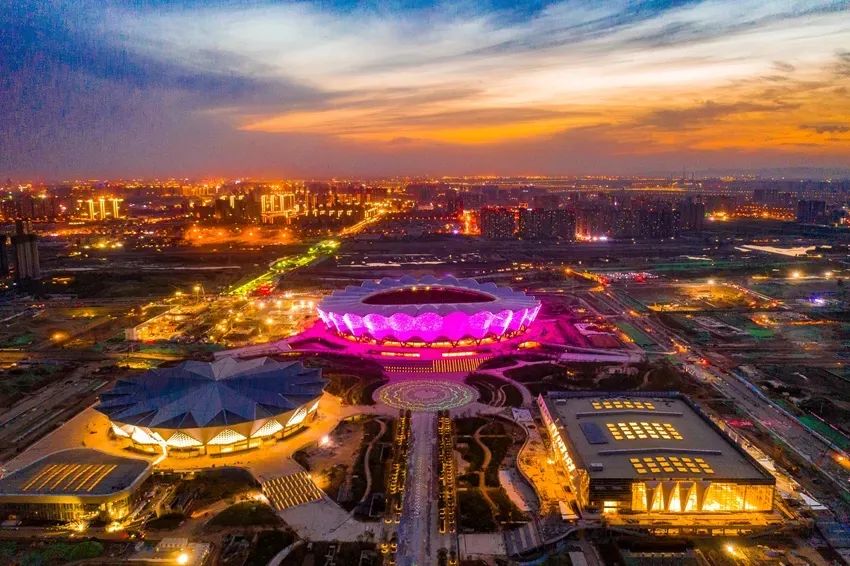 第十四屆全運會主場館西安奧體中心“一場兩館”呈“品”字形分布。從空中俯瞰西安奧體中心體育場,就像一朵巨大的“石榴花”,28個“花瓣”勾勒出石榴花綻放和絲綢舞動的韻律。