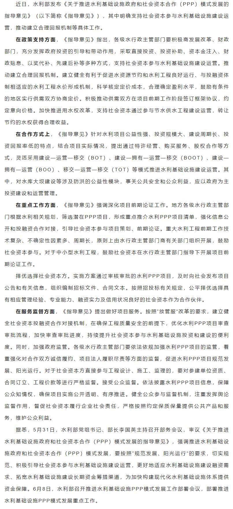 水利部|支持社會資本參與水利基礎(chǔ)設(shè)施PPP項(xiàng)目建設(shè)運(yùn)營